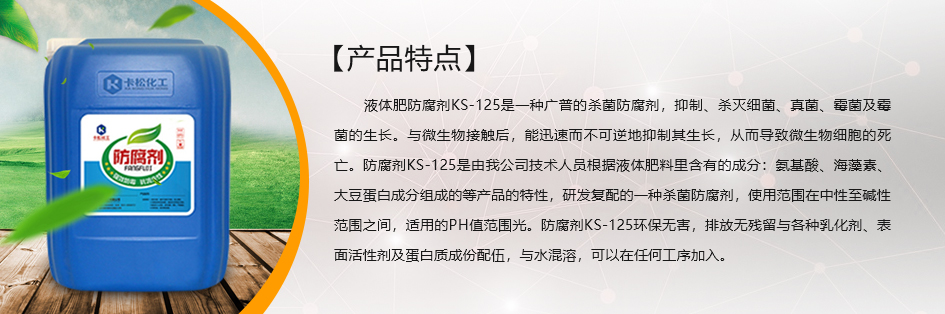 液体肥防腐剂KS-125一般使用浓度为0.1~0.40%(w/w),取决于产品是否容易受微生物侵蚀和产品的贮存环境,专一配方的准确添加量可由我公司化学微生物技术中心试验得出。