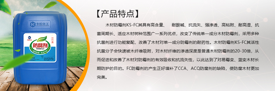 木材防霉剂KS-FC其具有高含量、 耐酸碱、抗流失、强渗透、高粘附、耐高湿、抗菌周期长、适应木材树种范围广一系列优点,改变了传统单一成分木材防霉剂,采用多种抗菌剂进行功能复配,改善了木材对单一成分防霉剂的耐药性。木材防霉剂KS-FC其活性抗菌分子会快速被木纤维吸附,对木材纤维的渗透深度是普通木材防霉剂的20-30倍,从而促进和改善了木材对防霉剂的有效吸收和抗流失性,以此达到了对易霉变、蓝变木材长期防护的目的。FC防霉剂的产生正好填补了CCA、ACQ防腐剂的缺陷,使防腐木材更加完美