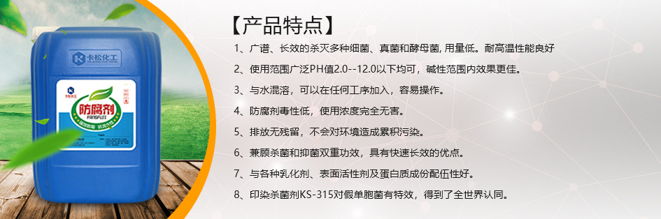 印染杀菌剂KS-315是一代新型的广谱防腐剂,可广泛地应用于工业产品的各个领域中,它由两种长效防腐剂复配而成,这两种组分的双重效果,使其成为了世界上应用最广的防腐剂之一,比任何一种单一的防腐剂效果均佳。印染杀菌剂KS-315对真菌、酵母菌活性适应性强,可以抑制和破坏这些微生物菌种的生长,能够解决因细菌感染而引起的产品变质、发酵、发霉及细菌数超标等问题。广泛应用于纺织行业、印染助剂、染料助剂、无纺布等体系。