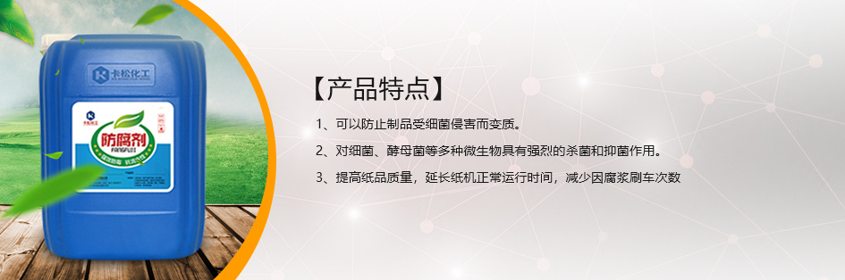纸浆杀菌剂KS-135造纸纸浆防腐剂是一种杀菌,抑菌长效广谱,长效防腐剂,其技术指标和使用效果均达到国外同类产品水平,该产品广泛应用于造纸,涂料,日用化工等领域中。可以防止制品受细菌侵害而变质。对细菌、酵母菌等多种微生物具有强烈的杀菌和抑菌作用。在造纸行业中,主要用于造纸纸浆或加工纸(涂布纸)涂料中,以防止浆料或涂料腐败。提高纸品质量,延长纸机正常运行时间,减少因腐浆刷车次数。从而有效的解决因微生物引起的纸张“斑点”“孔洞”“断头”等腐浆障碍,降低了停机刷车频率,提高纸张产品的品质和产量