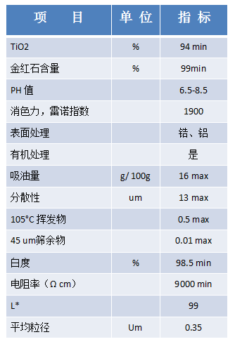 本品经锆、铝复合包膜表面有机处理高品质的氯化法金红石型产品,具有蓝色色调、高光泽、高耐久性、高遮盖力、低吸油量、分散性好等特点,能达到国外品牌的性能要求,替代国外产品使用,用于室外的装饰涂料,硅酮树脂,绘画颜料以及油墨,塑料行业等。