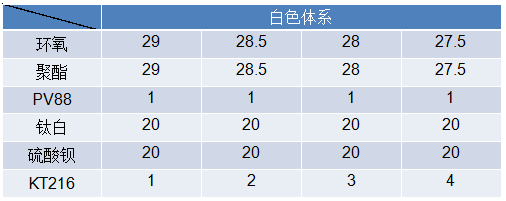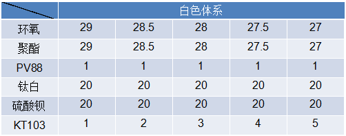 2.技术参数 外观:浅黄色至白色粉末 挥发分:<1.5% 熔程:110-130℃ 3.技术及应用特性 用于50/50及60/40体系。 在配方是集中可以通过不同酸价的聚酯组合来获得满意消光效果。 KT103为非蜡体系,可以应用于黑色体系中。 添加量为粉末总量的1%至5%,烘烤温度的波动和挤出螺杆剪切效果的差异不会对光泽造成显著影响。 4.参考配方 备注:环氧EEW800-900,聚酯:3B神剑,钛白:R902杜邦,硫酸钡:W-44HB。