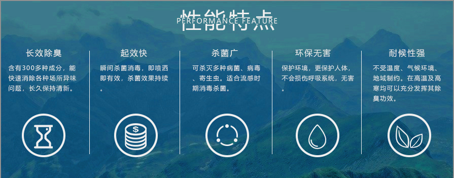 5、不受温度、气候环境、地域制约。在高温(50℃以下)及高寒(-15℃以上)均可以充分发挥其除臭功效;干旱和湿润地区亦可长效使用。