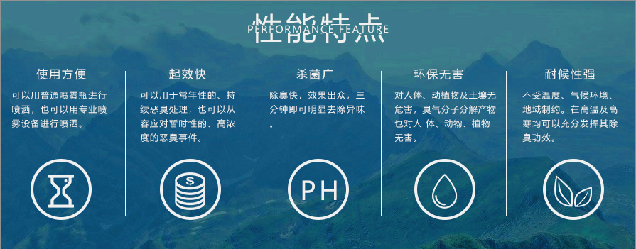 1、植物液除臭剂不受温度等气候环境制约,不会受到温度及环境的影响而使其无法发挥效果,有极强的耐候性,在高温(50℃以下)及高寒(-15℃以上)均可以充分发挥其除臭功效;不论是在潮湿地区,还是在干旱地区,其除臭功效基本不受影响。