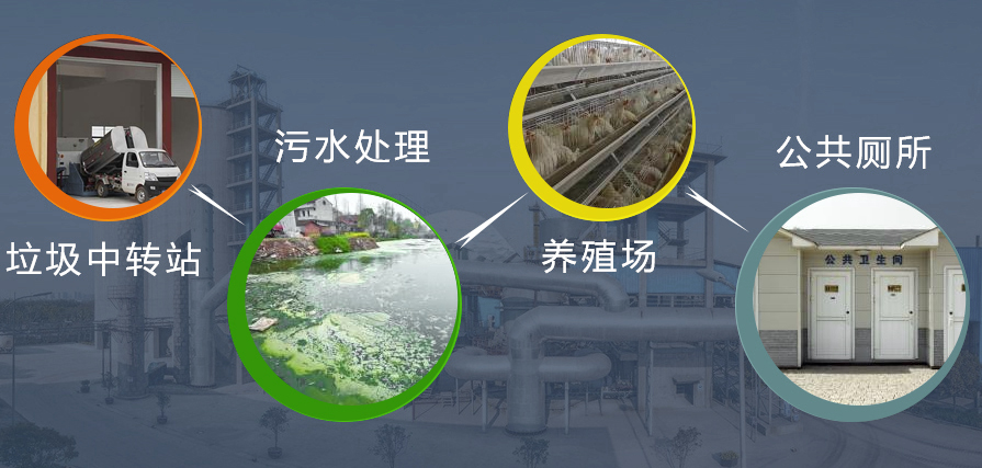 本品广泛用于畜牧养殖场、、水产养殖场、粪便处理中心、屠宰场、饲料加工、食品与渔业加工、公共厕所、 家居日用、垃圾处理厂、垃圾转运站、垃圾填埋场 、垃圾堆肥站 、制药厂、污水处理、包装印刷、市政污水处理、工业废水处理、交通运输工具等。