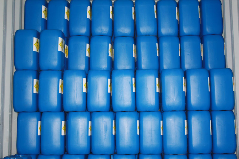 包装: 采用20、25kg容量,配有安全阻水释气孔盖的塑料方桶。桶材由进口原料5502塑料粒子组成,符合国际会规法,全部经国家商检局检查通过。 备注:可根据客户要求定制包装 保存期: 6个月内H2O2含量降低率不超过4%。 运输及贮存注意事项: (1)储存容器及可能用到的一切设备应小心选择,以减少反应的危险性。 (2)贮存于阴凉、干净防火的地方,远离可燃物、催化金属化合物和热源火源,避免阳光直射。 (3)容器应加盖保持排气,避免撞击等物理伤害及污染。 (4)保持容器内H2O2的纯度,取出后的溶液不要再放回原容器内。 (5)排空容器不要使用压力挤出排空。 (6)容器排空不用前,应以水冲洗干净。 (7)贮存处附近应备有水源。 (8)火灾爆炸及灭火方法 双氧水具有强氧化性,虽本身不可燃,但分解时产生的氧气能强烈地助燃,与易燃物、有机物接触后会引起爆炸,撞击、摩擦和震动时有燃烧爆炸的危险。 灭火方法:消防人员必须穿戴防火防毒服,尽可能将容器从火场移到空旷处,喷水冷却火场容器,直至灭火结束,处在火场中的容器,若已变形或众安全泄压装置中产生声音,必须马上撤离。 灭火剂:水、水雾 1.用大量水来稀释灭火,若使用化学性灭火剂,可能会加速过氧化氢分解。 2.水雾可用来灭火。 |