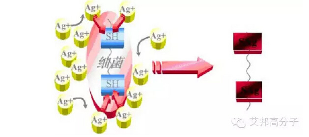 这是无机抗菌剂最普遍的抗菌作用机理。金属离子带有正电荷,当微量金属离子接触到微生物的细胞膜时,与带负电荷的细胞膜发生库伦吸引,使两者牢固结合,金属离子穿透细胞膜进入细菌内与细菌体内蛋白质上的疏基、氨基等发生反应。细胞合成酶的活性中心与金属离子结合后,该蛋白质活性中心的结构被破坏,造成微生物死亡或丧失分裂增殖能力。例如:银离子与蛋白质疏基的结合破坏了微生物的电子传输系统、呼吸系统和物质传输系统。