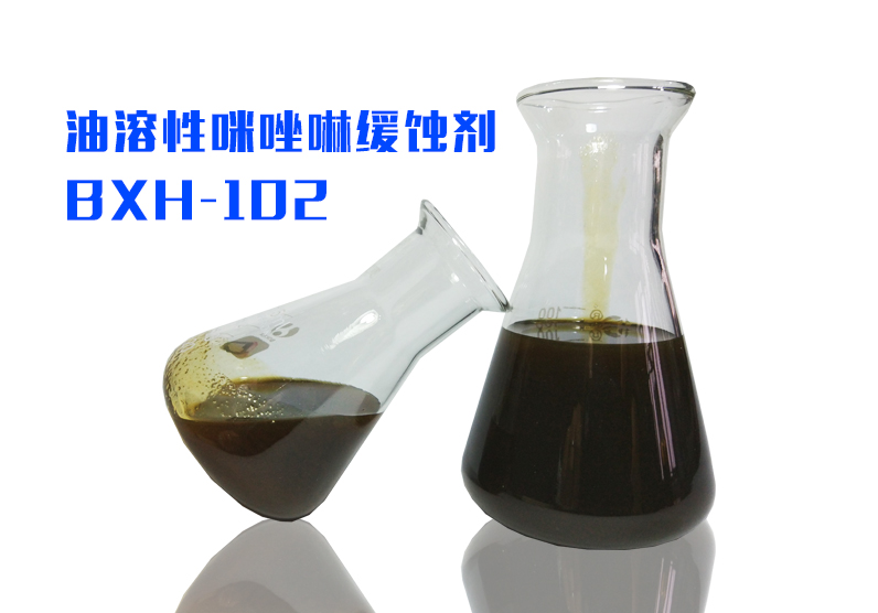 BXH-102是烷基咪唑啉结构的碱性有机中间体,是良好的吸附型油溶性缓蚀剂。溶于醇类和矿物油等非极性溶剂中,在水中呈分散状态不能完全溶解。分子中的咪唑啉环状结构可以强力吸附在金属表面,形成一层致密的分子膜结构,将亲水表面改变为疏水表面,从而能很好抑制CO2、H2S、HCl等酸性介质对金属的腐蚀。