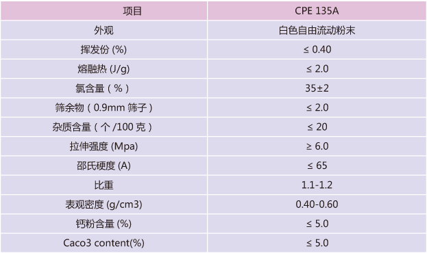 东临牌CPE 135A是由HDPE及氯气反应生成的具有线性结构的高分子聚合物,它本身是一种特殊的热塑性弹性体,它有着以下优异的化学特性:好的耐候性、阻燃性、耐化学品及耐臭氧等性能,它的基本功能是提高PVC制品的抗冲击强度及耐候性。