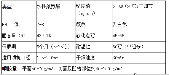 1.施胶方式:胶枪喷涂,建议喷枪口径为1-1.5mm,气盖为2.2-2.5mm,管长4m,内径6mm,压力1-1.5pa施胶量:平面65±5克/平方米,边及凹槽部位约100~120克/平方米(视材料吸附能力及操作略有差异)。