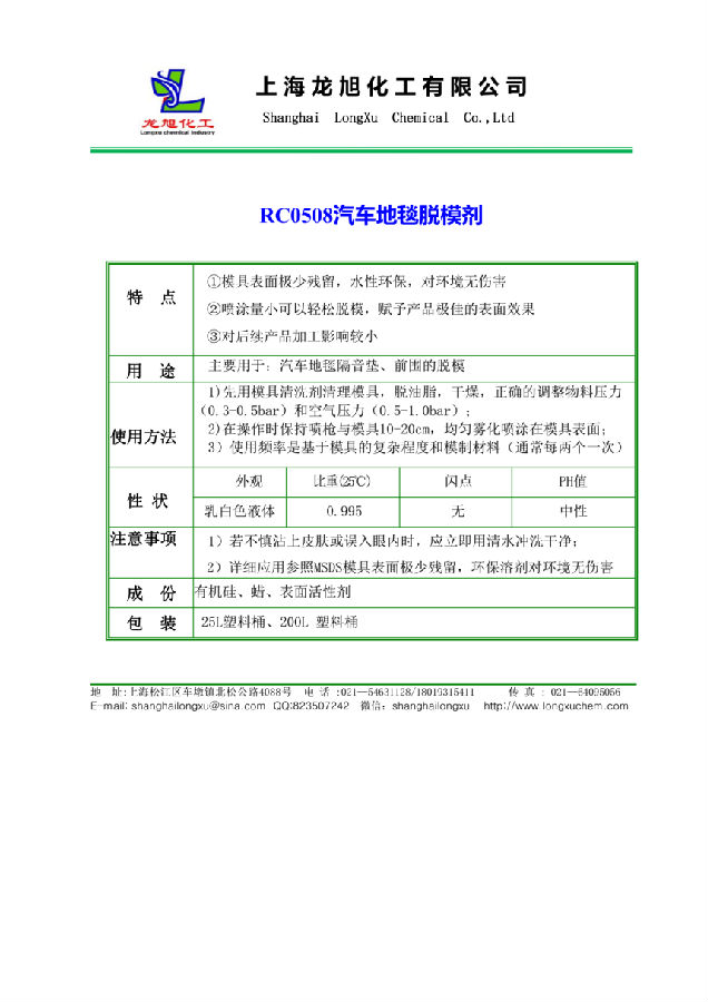 上海龙旭化工 RC0508汽车地毯脱模剂