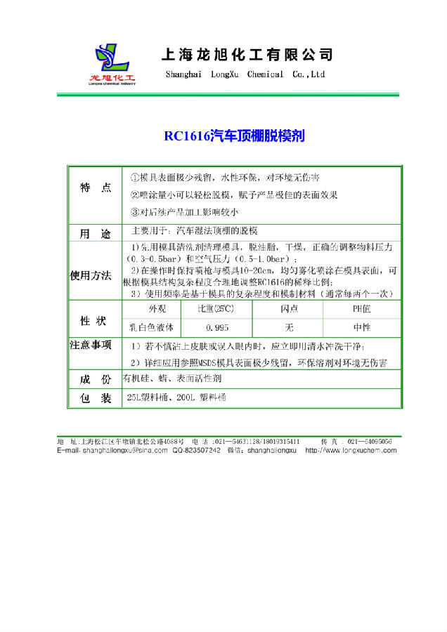 上海龙旭化工 RC1616汽车车顶脱模剂