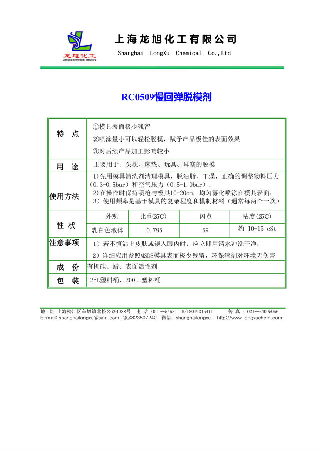上海龙旭化工 RC0509慢回弹脱模剂