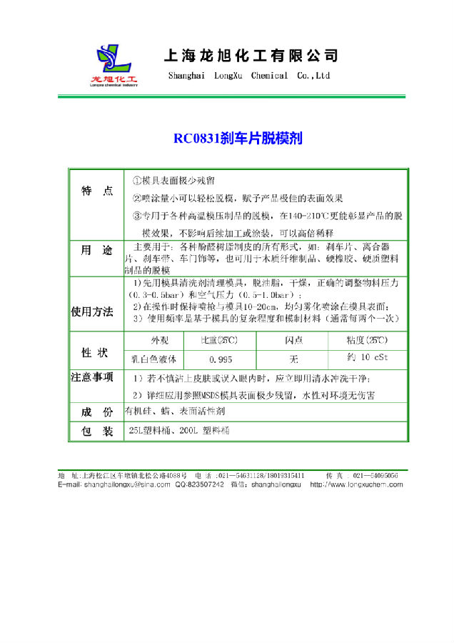 上海龙旭化工 RC0831 酚醛树脂脱模剂