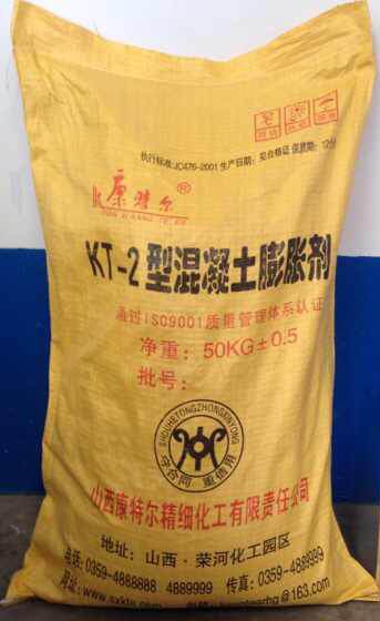 KT-2混凝土膨胀剂可以减少混凝土干缩裂缝,提高抗裂性和抗渗性,提高机械设备和构件的安装质量,加快安装速度,掺入本产品后,早期强度发展快,后期胀缩性能效果好,长期强度稳定增长,对钢筋无锈蚀,能很好地抑制碱骨料反应,本产品符合GB23439-2009标准要求。