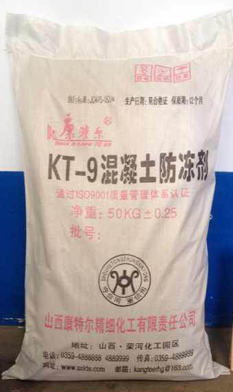 KT-9混凝土防冻剂是由早强和防冻组份,复合减水和引气组份组成的一种复合型防冻剂,该防冻剂具有掺量低、早期强度高、不含氯盐、阻止钢筋锈蚀、使用方便可靠、防冻效果显著等特点,可广泛用于工业及民用建筑的各种混凝土工程。混凝土中掺加本产品,可在日最低温度-10℃以上进行现浇混凝土冬季施工,不必采取加热养护措施,即可使新拌混凝土免遭冻害,在负温下凝结硬化,并在规定时间内达到预期强度。