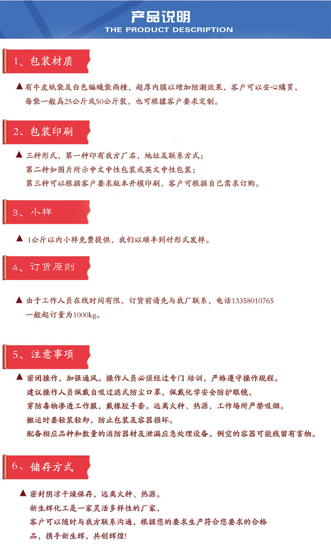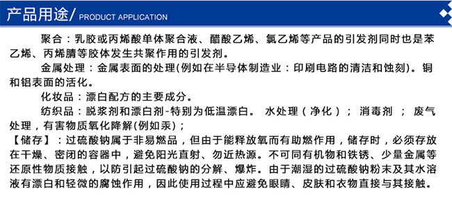 产品名称:过硫酸铵含 量:98%主要用途:用作保存剂、氧化剂以及高分子聚合物的引发剂C A S:7727-54-0详细说明:性状:无色单斜晶系结晶或白色结晶性粉末 相对密度:1.982 溶解性:易溶于水,0°C时溶解度58.2g/100ml水