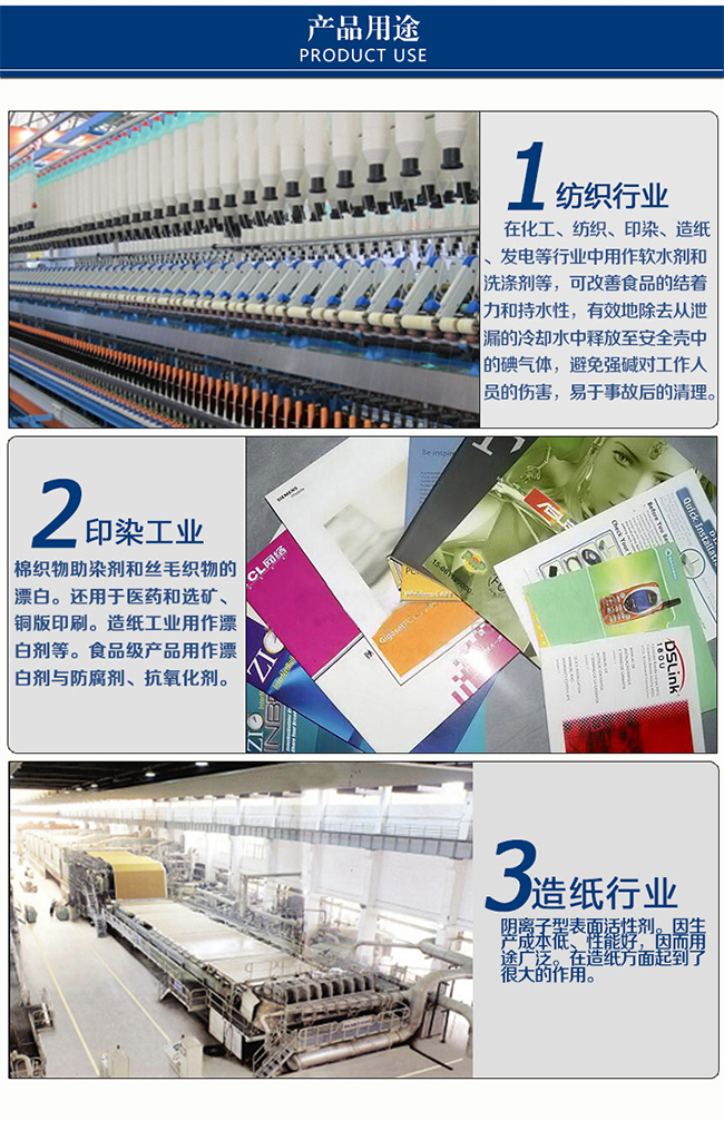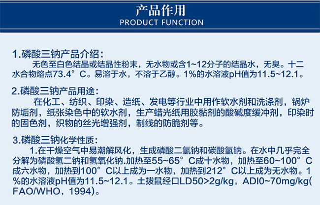 产品名称:磷酸三钠含 量:99%主要用途:在化工、纺织、印染、造纸、发电等行业中用作软水剂和洗涤剂C A S:7601-54-9详细说明:性状:无色或白色结晶 相对密度:1.62 溶解性:溶于水,其水溶液呈强碱性;不溶于乙醇、二硫化碳。