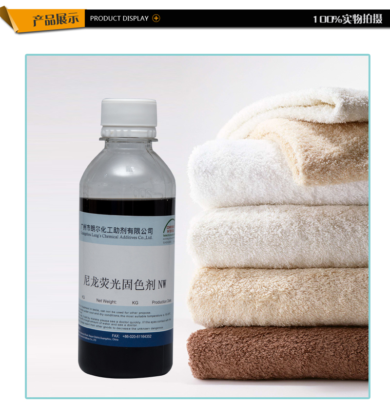 本品主要用于尼龙织物的固色处理,提高皂洗、沾色、汗渍,湿摩擦牢度,特别是耐氯牢度,色变极小,是市面上综合性能较全面的固色剂,完全不含甲醛,符合欧美环保要求。