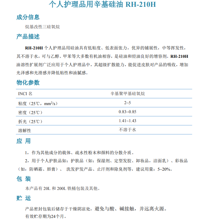 宁波润禾化学工业 有机硅新材料 个人护理品辛基硅油RH-210H