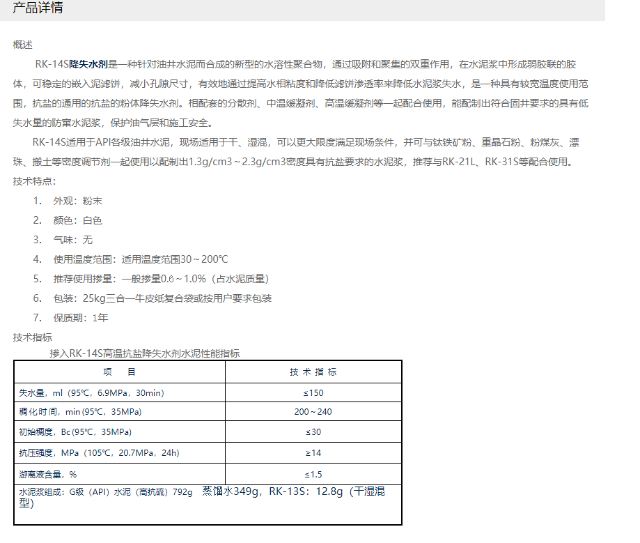 潍坊锐科助剂 RK系列油井水泥降失水剂 RK-14S油井水泥高温抗盐降失水剂(高温型)