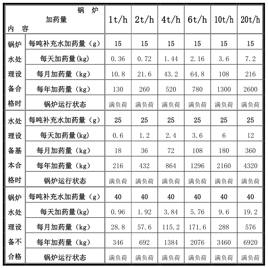 每天用药量(g)=锅炉蒸发量(t/h)×运行时间(h)×用药量(g/t)