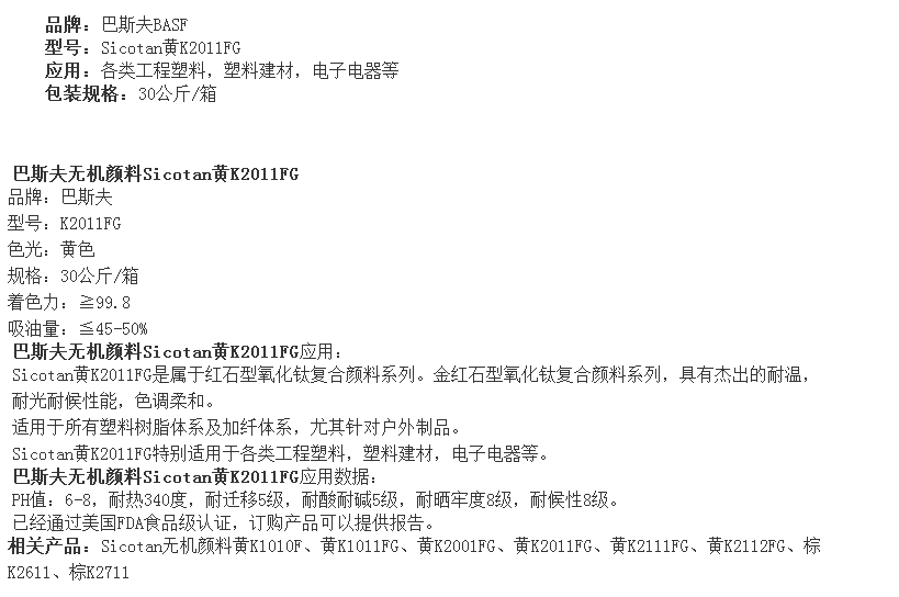德国巴斯夫(BASF)(汽巴)无机颜料Sicotan黄K2011FG