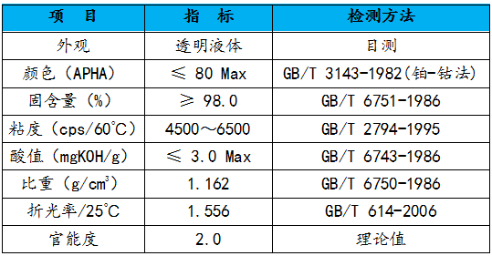 适合于纸张UV光油、塑胶UV光油、木器UV涂料及UV油墨等。