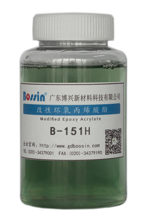 B-151H是脂肪酸改性双酚A型环氧丙烯酸酯,含10%的HDDA。与普通环氧丙烯酸酯(EPA)相比,相同温度下的粘度和黏性都有增加,其柔韧性、耐黄变、耐水煮、耐盐雾性能有显著提高, 同时保持了环氧树脂的极性刚性结构,对ABS、PC/ABS、纸张、木材有良好附着力。总体来讲,B-151H兼具EPA和PUA的双重特性,比EPA的固化体积收缩率低、固化速率偏慢,比PUA的拉伸强度低、伸长率小和固化速率高,可以做到非常理想的柔而韧的漆膜。