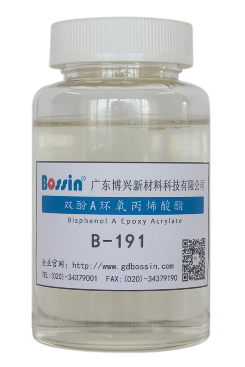 B-191是酚醛环氧丙烯酸酯,由酚醛环氧树脂F51丙烯酸酯化得到,不含溶剂,反应过程用约40%质量比TMPTA稀释,是特别为PCB油墨使用主体树脂。