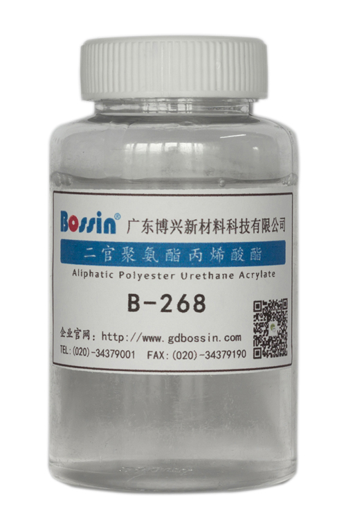 B-268是双官能度大分子量脂肪族聚氨酯丙烯酸酯,其脂肪族结构赋予树脂优异的耐黄变性能,具有优异的柔韧性、良好层间附着力和极好的断裂伸长率,在UV固化配方中可以调节配方的硬度和柔韧性,平衡配方的耐水煮、耐盐雾、耐高低温及冷热循环性能。相对于普通两官能度聚氨酯丙烯酸酯而言,B-268具有最低的体积收缩率和更优的附着力。