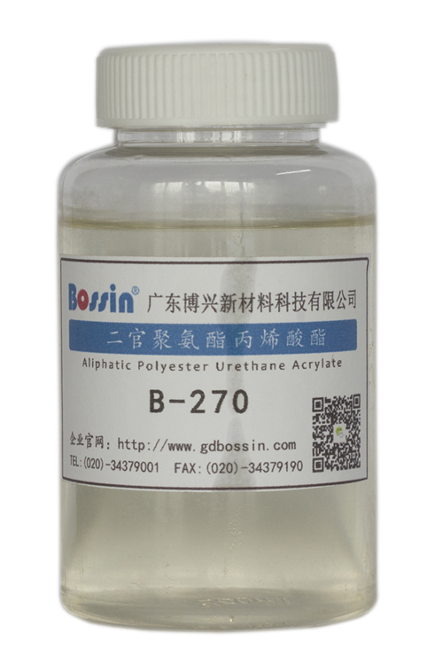 B-270是特殊开发低粘度双官能度PUA树脂,其由特殊工艺合成,是目前市场上粘度极低而氨基甲酸酯含量较高的高柔韧性聚氨酯丙烯酸酯,还具有优异的耐候性、固化速率快、快速流平等特性,用于UV塑胶喷涂,可以调节配方的硬度和柔韧性,平衡配方的耐水煮、耐盐雾、耐高低温及冷热循环性能;用于UV印刷光油和油墨,可以作为配方的主体树脂,对于调配“高固低粘”的配方体系有很好帮助,对配方的柔韧性有提高。