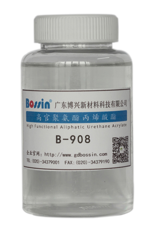 B-908是采用最新工艺生产的一支高官能度脂肪族聚氨酯丙烯酸酯,理论官能度8~9,其突出特点是具有比较均衡的硬度和柔韧性,对震动耐磨和弯折测试效果良好;此外在UV固化活性、耐溶剂性、抗擦伤性、耐磨、硬度、耐候性等方面可满足要求,性能良好;该树脂还有很好的透明度、表面流平效果和光泽度。对PC、ABS、PMMA、PVC等多种塑胶底材具有优良的附着性能,即使单独使用也可获得良好的附着力。