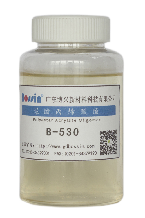 B-530是一支四官能度聚酯丙烯酸酯,树脂具有良好的UV固化速率,颜料润湿性能,在胶印色墨体系中的突出特点是疏水性、低黏性和触变性,为油墨提供稠而不粘即剪切变稀的印刷效果,对于胶印飞墨有很好的改善作用。