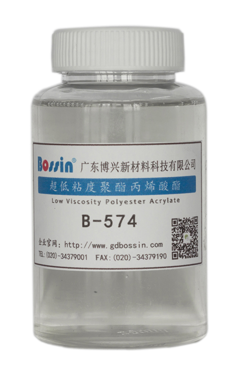 B-574是一种高官能度的聚酯丙烯酸酯,无苯无气味,低粘性,快速固化,与其它树脂相溶性好,对颜料润湿分散性佳。B-574的VOC可满足烟包标准,粘度只是TMPTA的5~8倍,但固化硬度接近DPHA,曝光能量比DPHA还低,100mJ/cm2的UV能量可以使50微米膜厚一次全干。