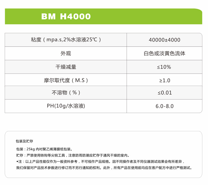 BM H4000 Powder this product has the property of easy to dissolve, less foam, good thickening and color scattering effect with stable quality. Because of non-ionic base, it shows wide range of formula adjusting ability in a wide PH value range. What's more, it has the advantage that, while the pigment is grinding it can add in the water to control hydration process.