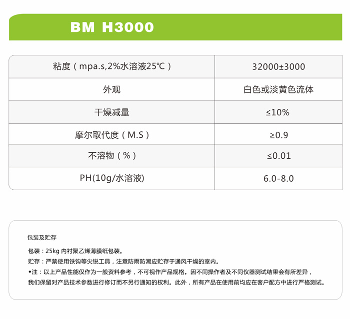 BM H3000 具有溶解快、泡沫少、增稠效果好、展色性好和更稳定等性能。它具有优异的抗飞溅作用,良好的抗流挂性能,在一个广泛的PH值范围内稳定并允许有广泛的配方范围。它更优越的性能是在开始进行颜料研磨前将其加入水中可控制水合作用。主要被开发应用于生产乳胶漆,且比其它增稠剂的用量小。