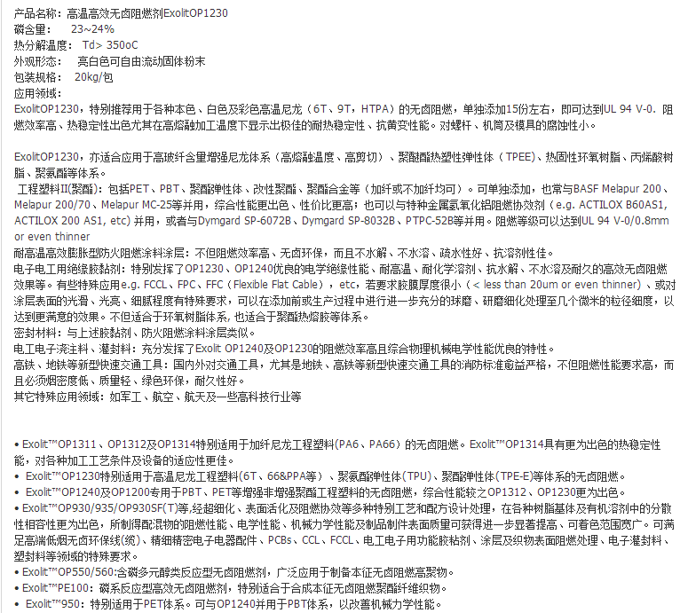 瑞士科莱恩阻燃剂Exolit OP 1230系列
