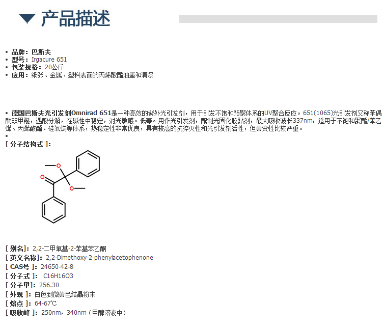 原装进口巴斯夫(BASF)光引发剂651(IRGACURE 651)