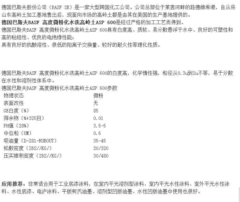 德国巴斯夫BASF高度微粉化水洗高岭土ASP 600
