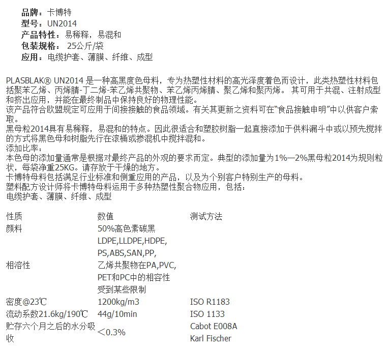 美国卡博特原装高级注射通用型黑色母粒UN2014