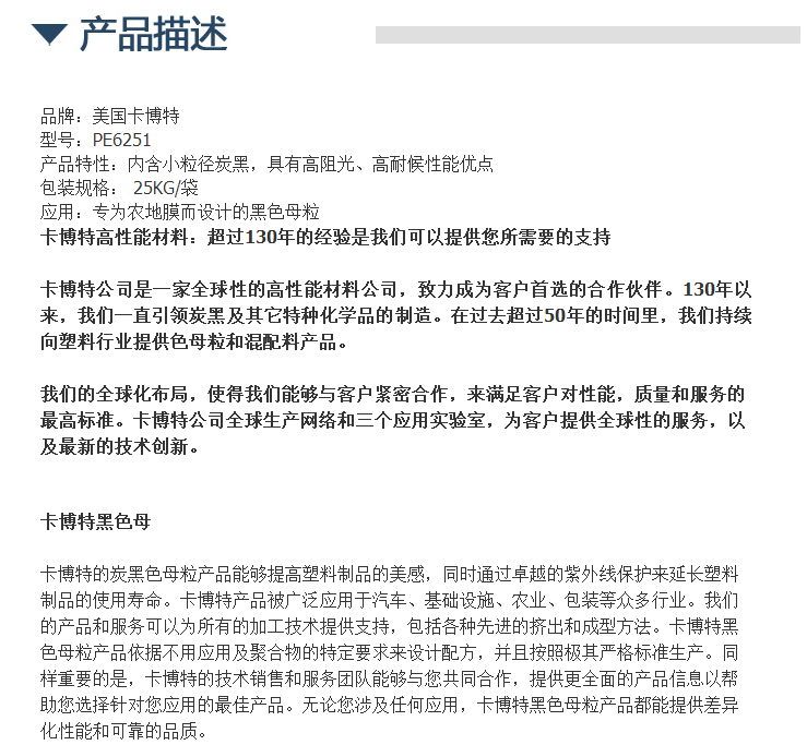美国卡博特KABOT黑色母粒PE6251