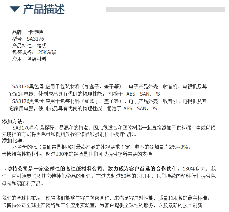 原装进*口美国卡博特KABOT黑色母粒SA3176