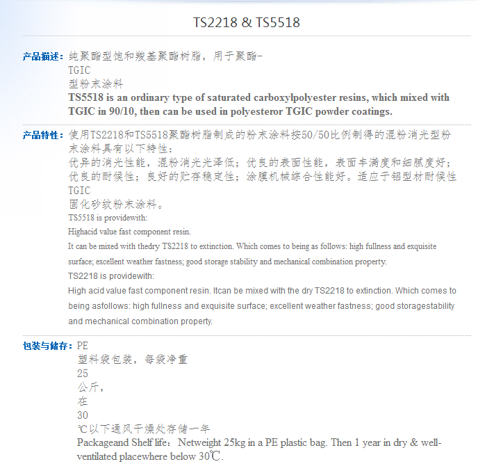 浙江天松 纯聚酯型饱和羧基聚酯树脂 TS2218 & TS5518