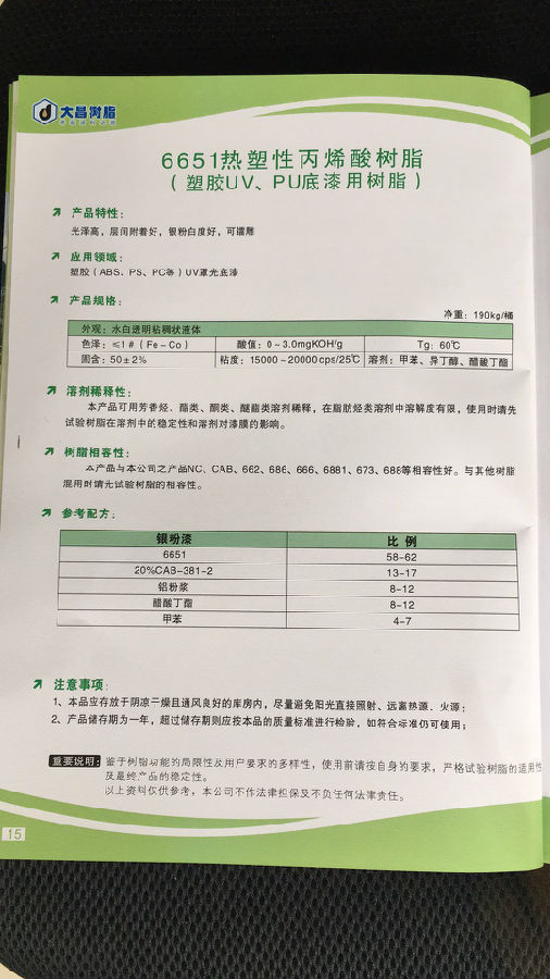 大昌树脂 6651热塑性丙烯酸树脂(塑料UV PU底漆用树脂)