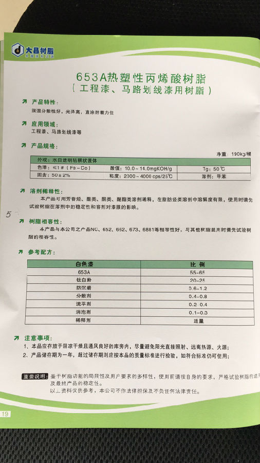 大昌树脂 653A热塑性丙烯酸树脂(工程漆 马路划线漆用树脂)