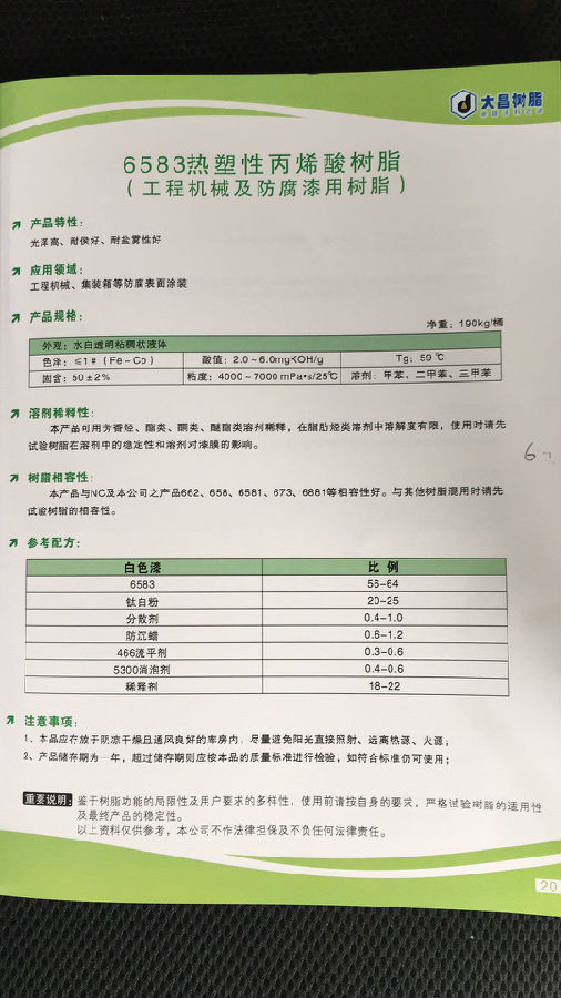 大昌树脂 6583热塑性丙烯酸树脂(工程机械及防腐漆用树脂)