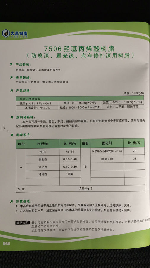 大昌树脂 7506羟基丙烯酸树脂(防腐漆 罩光漆 汽车修补漆用树脂)