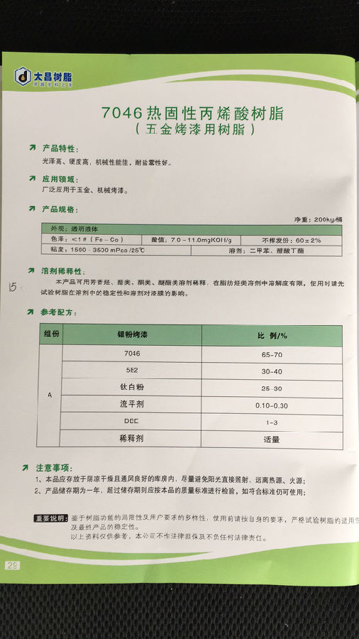 大昌树脂 7046热固性丙烯酸树脂(五金烤漆用树脂)