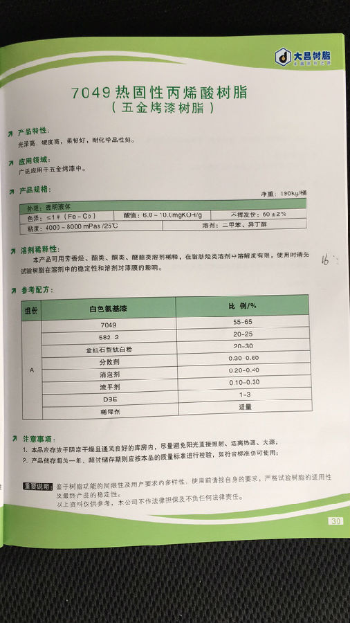 大昌树脂 7049热固性丙烯酸树脂(五金烤漆用树脂)